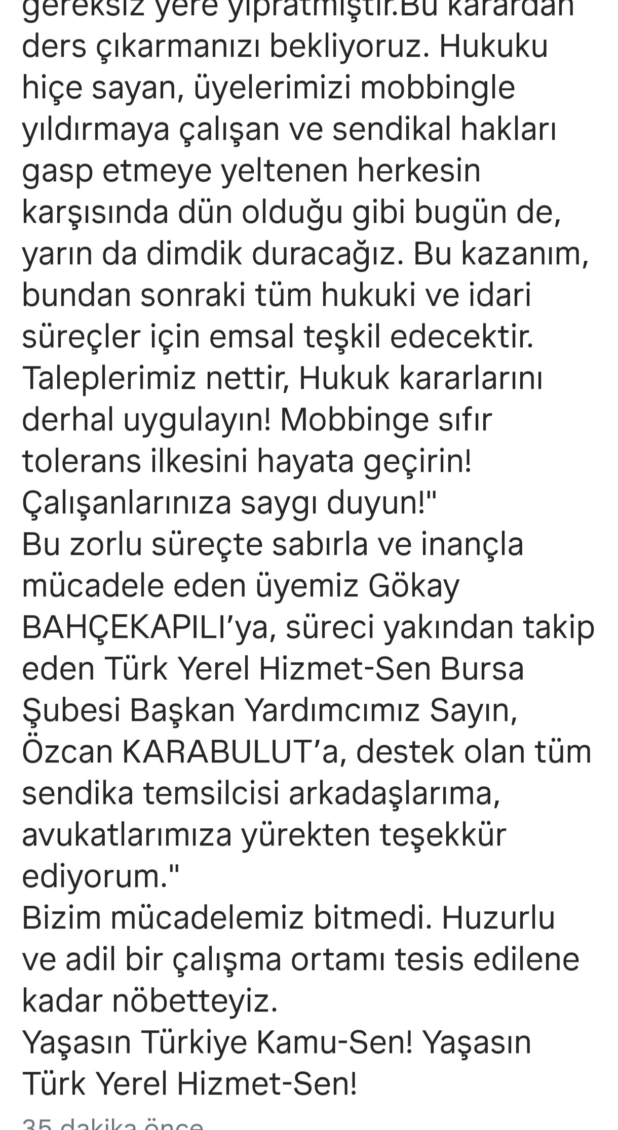 Türk Yerel Hizmet Sen Bursa Bölge başkanlığı tarafından dava ilişkin yapılan duyuruda, “Çok kıymetli üyelerimiz, Gebze Belediyesi’nde görev yapan yüksek çevre mühendisi Gökay Bahçekapılı’yı ünvanına ve eğitimine uygun olmayan birimlerde görevlendirmek, fiilen görev yaptırmayıp hukuksuz mobbing uygulamalarına karşı başlattığımız onur mücadelesi nihayet sonuçlandı. Buradan, Gebze Belediyesi yönetimine sesleniyoruz; Hukuk kazandı!Adalet yerini buldu. Mobbing yapanlar hesabını verecek!” Talebimiz nettir hukuk kararlarını derhal uygulayın” ifadelerine yer verildi